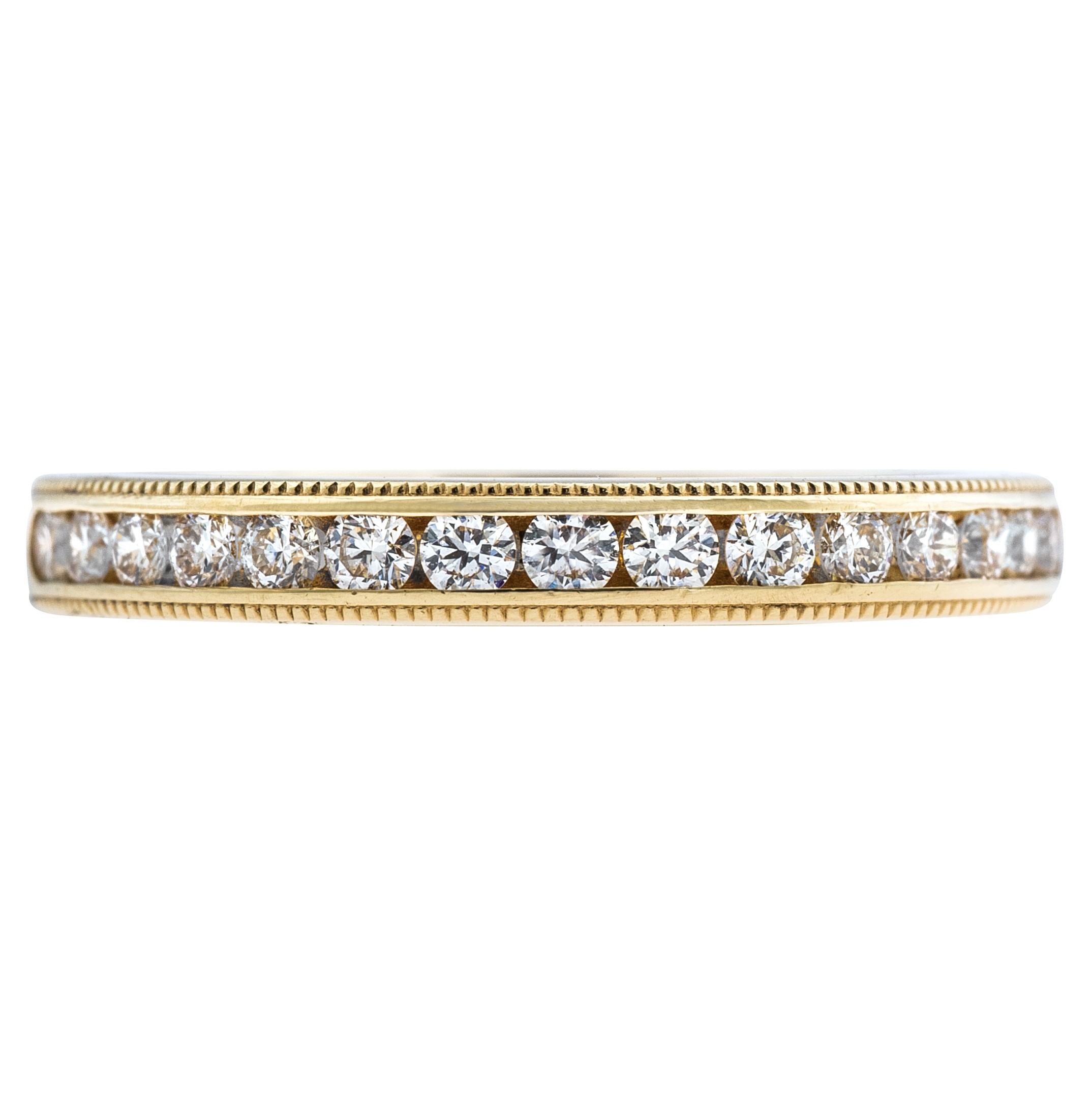 A dazzling row of Hearts On Fire Diamonds is channel-set in a milgrain band, making this the perfect standalone or stackable diamond wedding ring. Comes in 18ct Yellow, Rose or White Gold, with your choice of Signature or Sensational Diamond Quality.